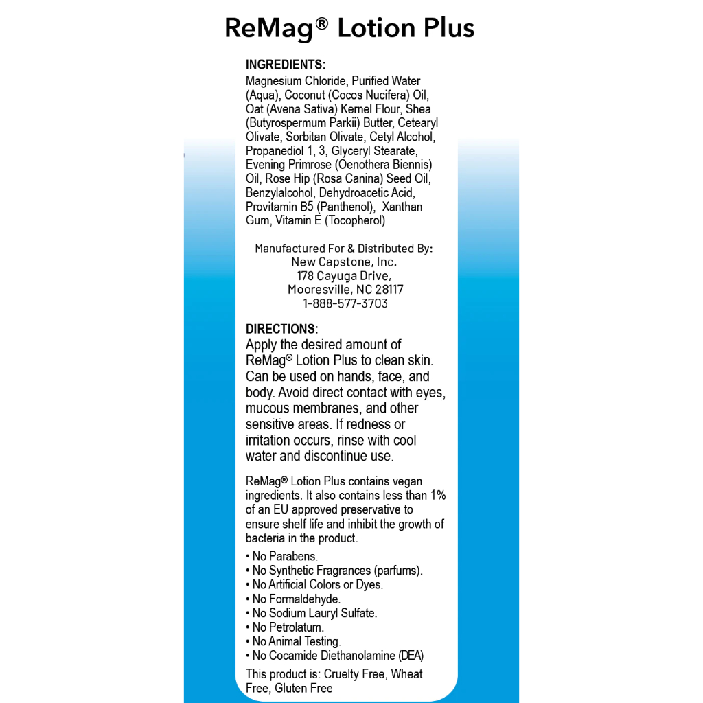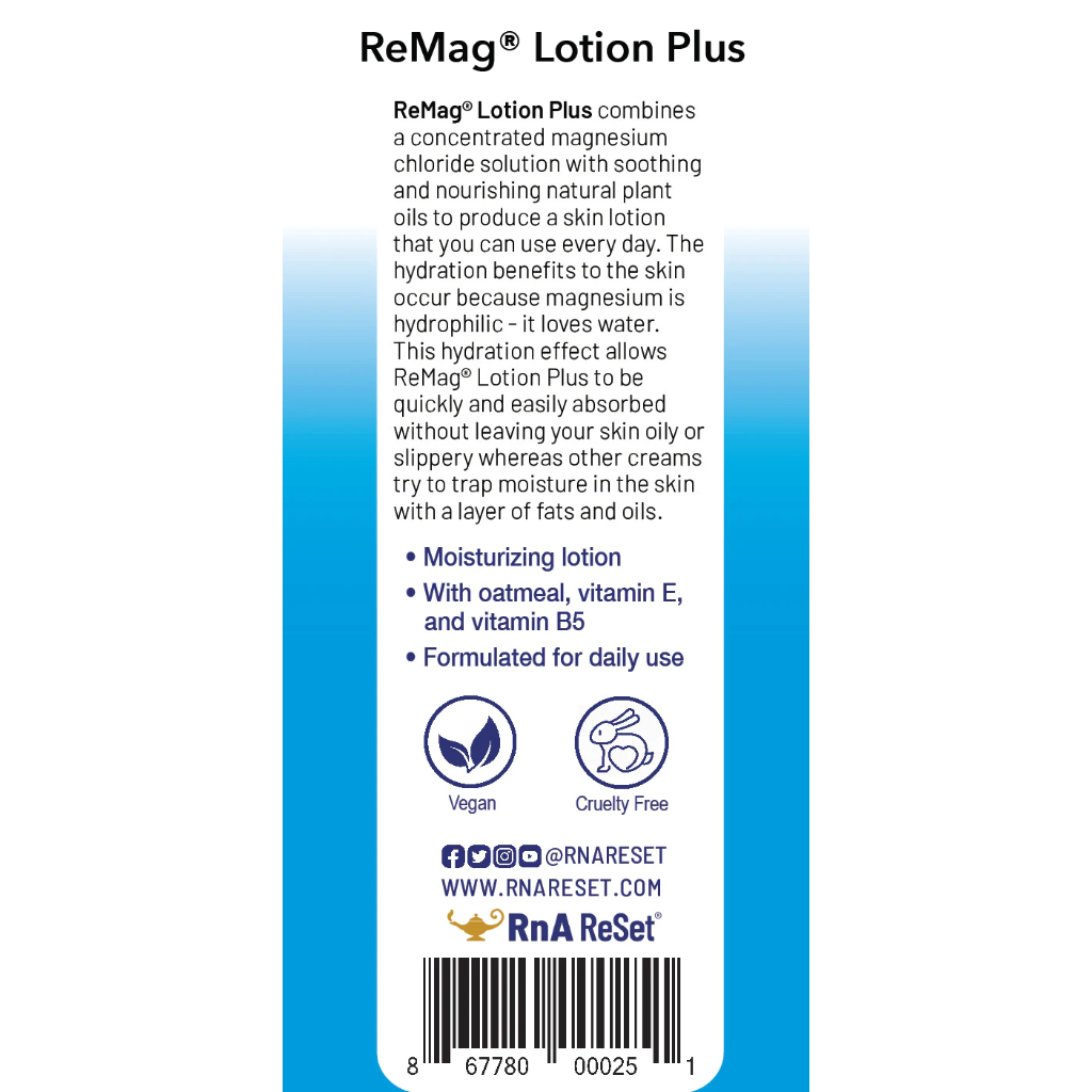 ReMag® Lotion Plus vylepšená verzia nášho pôvodného ReMag Lotion s ďalšími prísadami pre spokojnú pokožku. Toto kozmetické mlieko je ideálne na aplikáciu na citlivejšie oblasti pokožky, ako napr. tvár. Ľahká, prirodzená vôňa sprevádza tento vysoko účinný denný hydratačný krém na podporu potrieb pleti. Môžete používať denne.