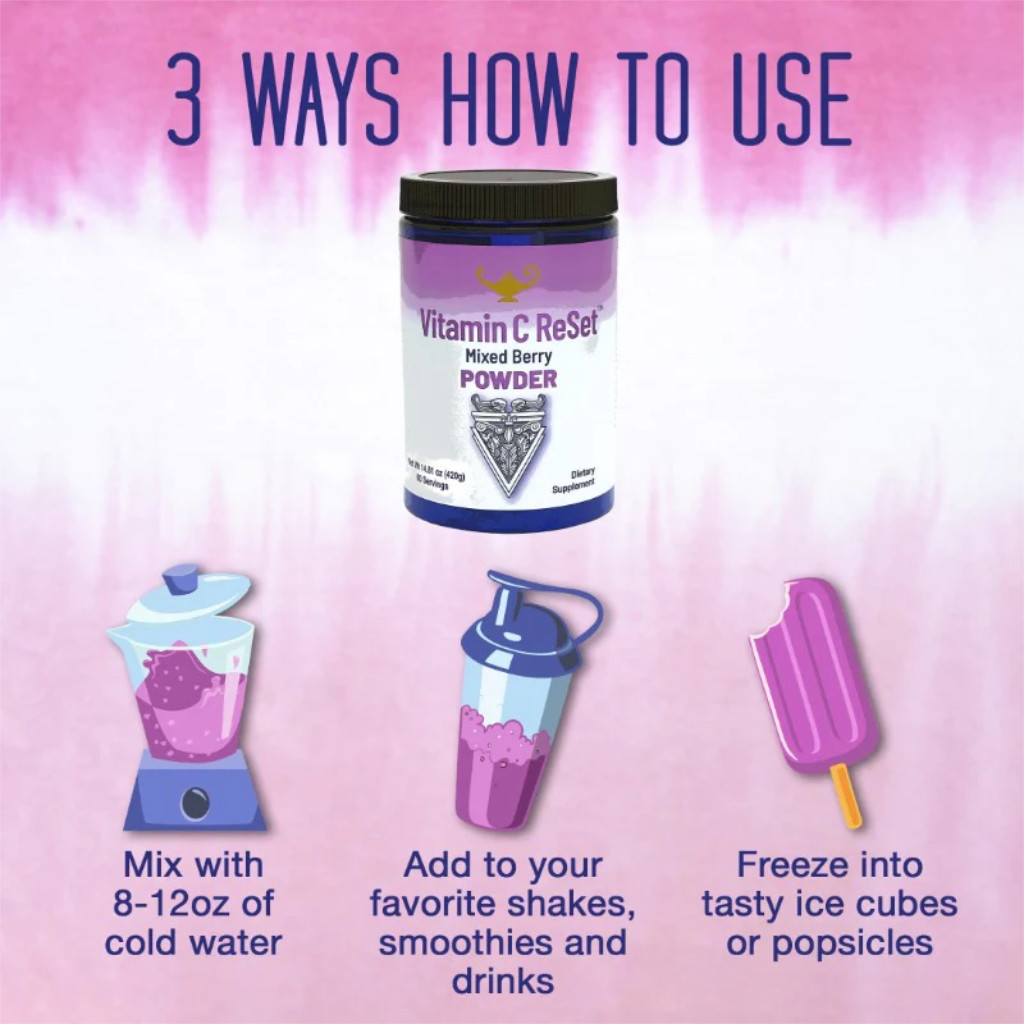 Vitamín C Reset® v lahodnej, šumivej práškovej forme s príchuťou bobúľ. V 7 gramovej odmerke obsahuje 2 050 mg vitamínu C a 410 mg draslíka, takže je ľahké rozdeliť dávku na menšie porcie, aby ste získali lepšiu kontrolu nad svojím denným príjmom.