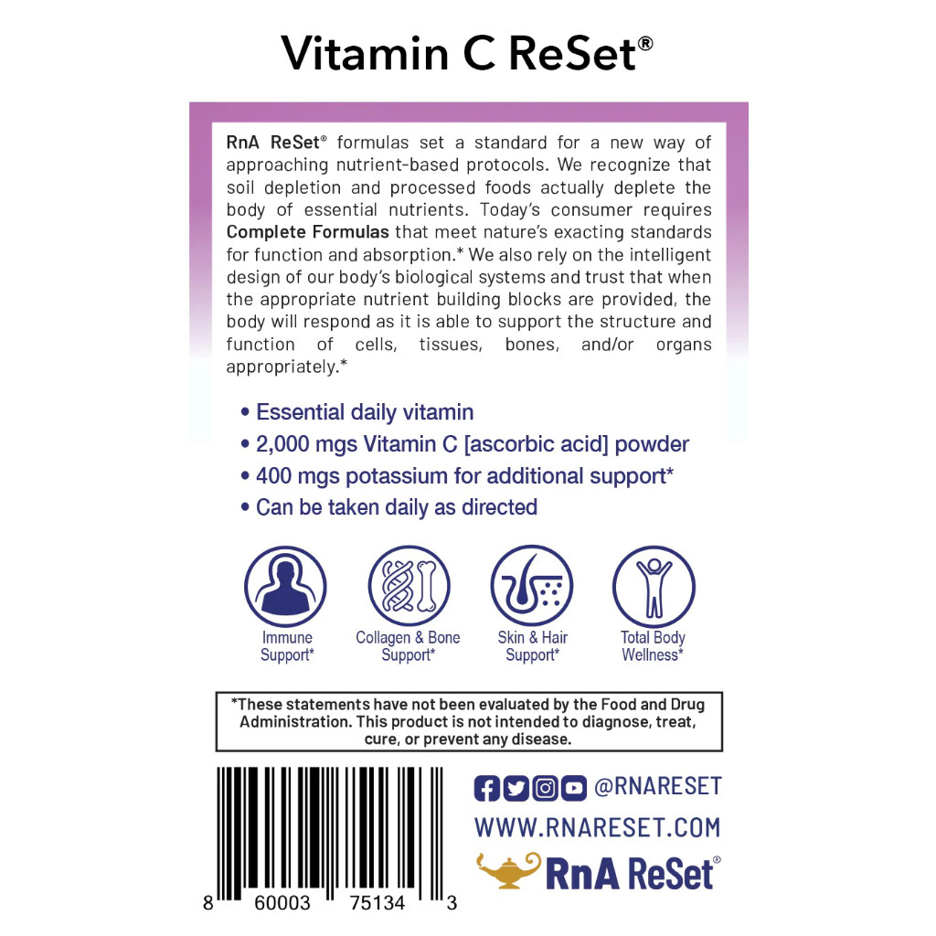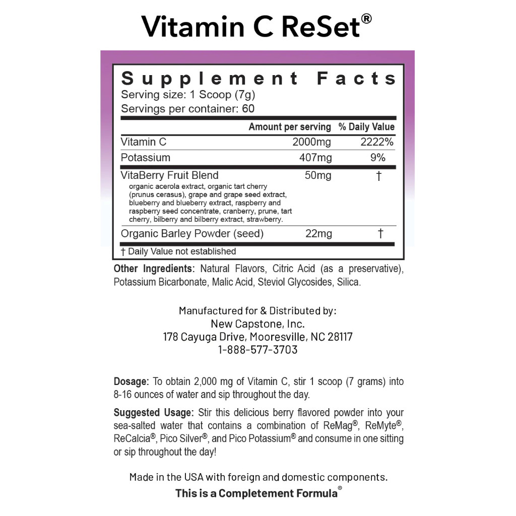 Vitamin C ReSet® v lahodnej, šumivej práškovej forme s príchuťou bobúľ. V 7 gramovej odmerke obsahuje 2 050 mg vitamínu C a 410 mg draslíka, takže je ľahké rozdeliť dávku na menšie porcie, aby ste získali lepšiu kontrolu nad svojím denným príjmom.